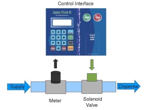 After the card is placed next to the control interface, it is checked for its credit limit. When the Start button is pressed, a preset amount is deducted from the card, and then the electric valve is opened, allowing water to flow. The meter measures the water flow, and sends this information to the control interface. When the user presses the Stop button, the valve is closed and the system then adjusts the value on the customer's card to reflect the actual amount dispensed.